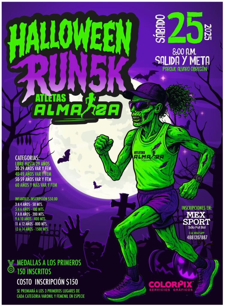 Matehuala se prepara para vivir una edición especial llena de energía y diversión con la primera Carrera de Halloween «Atletas Almanza», programada para el sábado 25 de octubre de 2025, a las 8:00 de la mañana en el Parque Álvaro Obregón. El evento contará con categorías para adultos e infantiles, incentivando la participación familiar. El costo de inscripción será de $150 pesos para la carrera de 5 kilómetros y $50 pesos para las carreras infantiles. Además, se otorgarán 150 medallas conmemorativas a los primeros inscritos.