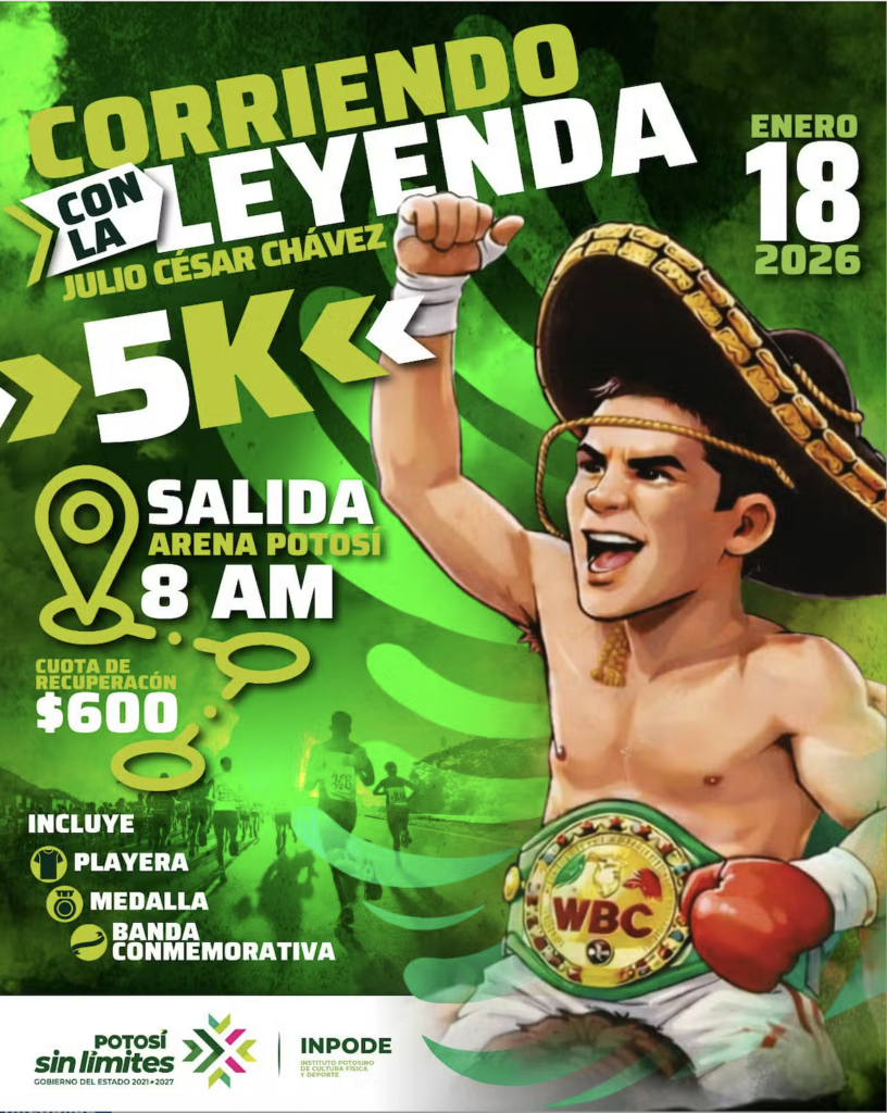 Con el objetivo de iniciar el año cumpliendo propósitos de salud y fomentando la actividad física, el Gobierno del Estado de San Luis Potosí, encabezado por el gobernador Ricardo Gallardo Cardona, a través del Instituto Potosino de Cultura Física y Deporte (INPODE), invita a la ciudadanía a participar en un evento deportivo sin precedentes: correr al lado de la máxima leyenda del boxeo mexicano, Julio César Chávez.