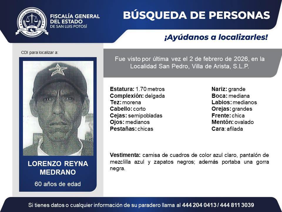 Las autoridades activaron una alerta de búsqueda para localizar a Lorenzo Reyna Medrano, de 60 años de edad, quien fue visto por última vez el pasado 2 de febrero de 2026 en la localidad de San Pedro, perteneciente al municipio de Villa de Arista.