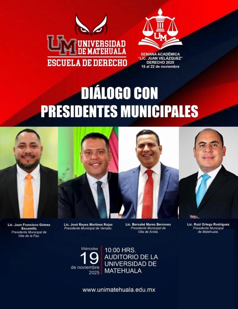 La mañana de este miércoles 19 de noviembre, estudiantes de la Universidad de Matehuala vivieron un episodio de molestia e inconformidad luego de que dos alcaldes invitados a la Semana Académica “Lic. Juan Velázquez” de la carrera de Derecho 2025 no se presentaran a la charla que tenían comprometida. El evento, que se desarrolla del 18 al 22 de noviembre, contemplaba la participación de diversas autoridades municipales como parte de un ejercicio formativo para los jóvenes.