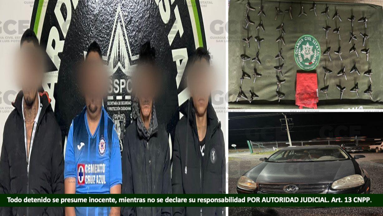 Con resultados firmes en materia de prevención y disuasión del delito, la Guardia Civil Estatal (GCE) informó sobre trabajos operativos realizados en el municipio de Matehuala, donde fueron detenidos cuatro presuntos generadores de incidencia criminal en posesión de objetos conocidos como “poncha llantas”.