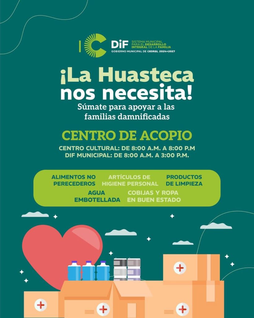 Ante las intensas lluvias e inundaciones que han afectado a la zona Huasteca, el municipio de Cedral hace un llamado a la población para sumarse al apoyo de las familias damnificadas. La solidaridad de la comunidad será fundamental para brindar ayuda a quienes más lo necesitan.