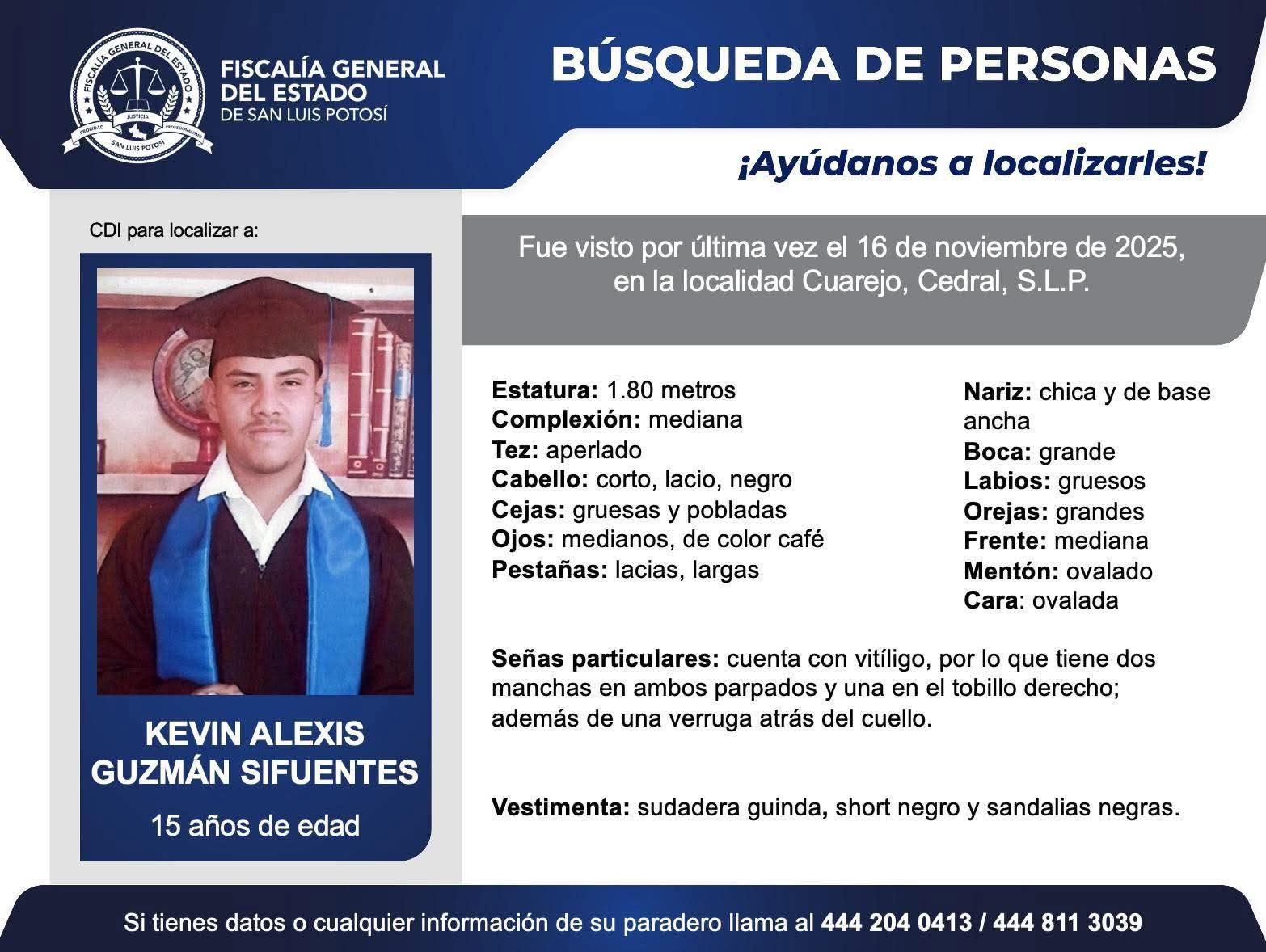 Autoridades estatales y familiares mantienen activo un operativo de búsqueda para localizar a Kevin Alexis Guzmán Sifuentes, un adolescente de 15 años que desapareció el pasado 16 de noviembre de 2025 en la localidad de Cuarejo, perteneciente al municipio de Cedral, en la zona Altiplano de San Luis Potosí.