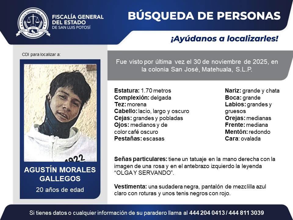 La Fiscalía General del Estado de San Luis Potosí emitió una alerta de búsqueda para localizar a Agustín Morales Gallegos, un joven de 20 años cuyo paradero se desconoce desde el 30 de noviembre de 2025. De acuerdo con la información oficial, Agustín fue visto por última vez en la colonia San José, en el municipio de Matehuala, y desde entonces su familia no ha logrado establecer contacto con él.