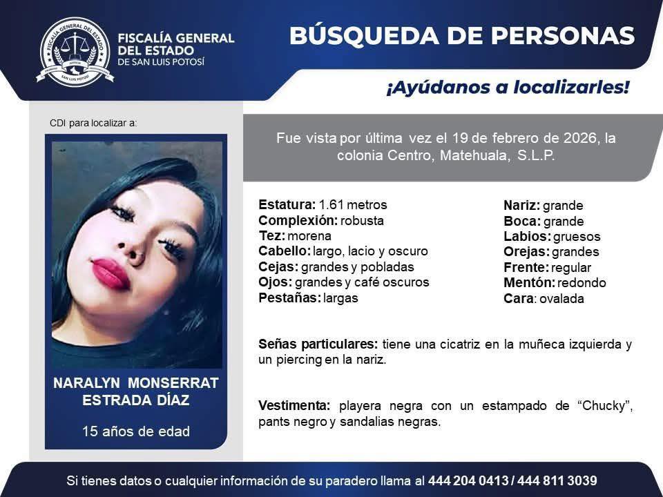 La Fiscalía General del Estado de San Luis Potosí emitió una ficha de búsqueda para localizar a Naralyn Monserrat Estrada Díaz, de 15 años de edad, quien fue vista por última vez el pasado 19 de febrero de 2026 en la colonia Centro de Matehuala.
