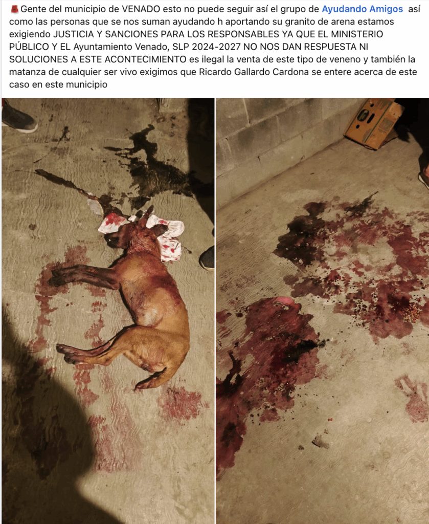 La organización Ayudando Amigos denunció públicamente el envenenamiento de al menos cinco perros en el municipio de Venado. A través de una publicación en su página de Facebook, el grupo señaló que los incidentes ocurrieron durante la última semana en las calles Ocampo, Ánimas y Rayón, y alertaron sobre el riesgo que representa este tipo de actos para la comunidad y los animales. La organización pidió que se sancione a los responsables y se prohíba la venta de los venenos utilizados, que consideran altamente peligrosos y de fácil acceso.