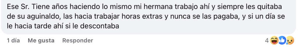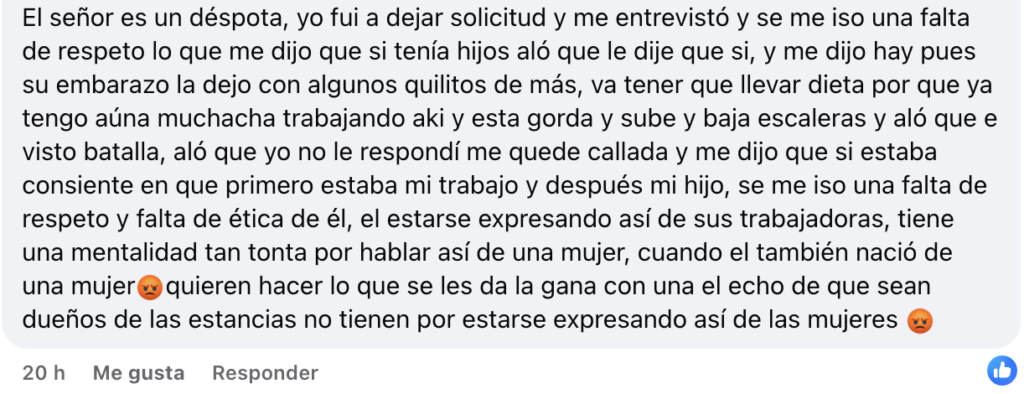 En los comentarios difundidos en redes sociales, otras ciudadanas respaldaron las acusaciones y aseguraron que estas prácticas no son nuevas. Una usuaria afirmó que el responsable del lugar tiene años actuando de la misma manera, obligando a las trabajadoras a laborar horas extras sin pago y descontando dinero incluso por retrasos mínimos. Otra mujer relató una experiencia durante una entrevista de trabajo, en la que dijo haber sido víctima de comentarios ofensivos y discriminatorios relacionados con su apariencia física, maternidad y prioridades personales, calificando la actitud del entrevistador como una falta de respeto y ética profesional.