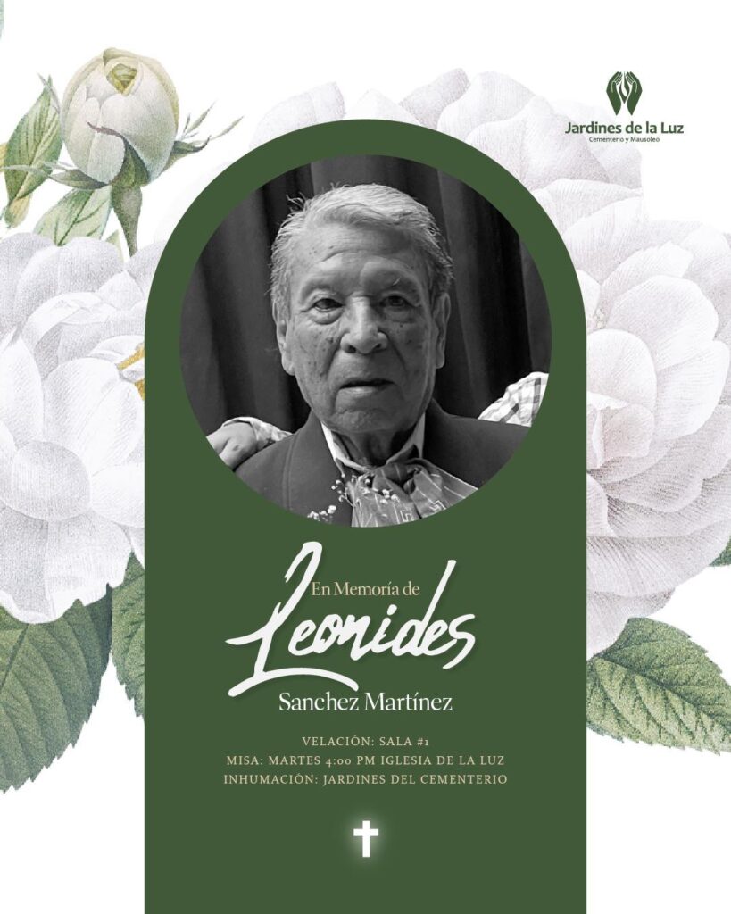 Los servicios funerarios del maestro Leonides Sánchez se llevarán a cabo en la Sala #1, donde familiares, amigos y compañeros músicos podrán brindarle el último adiós. La misa de cuerpo presente se oficiará el martes a las 4:00 de la tarde en la Iglesia de la Luz, para posteriormente realizar la inhumación en los Jardines del Cementerio, donde sus restos descansarán de manera definitiva.