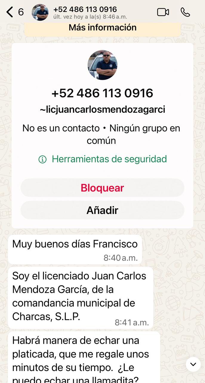 La población de Charcas, fue alertada este miércoles sobre un nuevo intento de fraude mediante suplantación de identidad, luego de que personas desconocidas comenzaran a contactar a vecinos del municipio haciéndose pasar por Juan Carlos Mendoza García, director de Seguridad Pública Municipal. El número telefónico desde el cual se están emitiendo los mensajes es +52 486 113 0916, y de acuerdo con los reportes recibidos, los delincuentes intentan iniciar una conversación casual para generar confianza. El supuesto funcionario les escribía con la intención de “platicar tantito”, para posteriormente solicitar información o proponer encuentros.