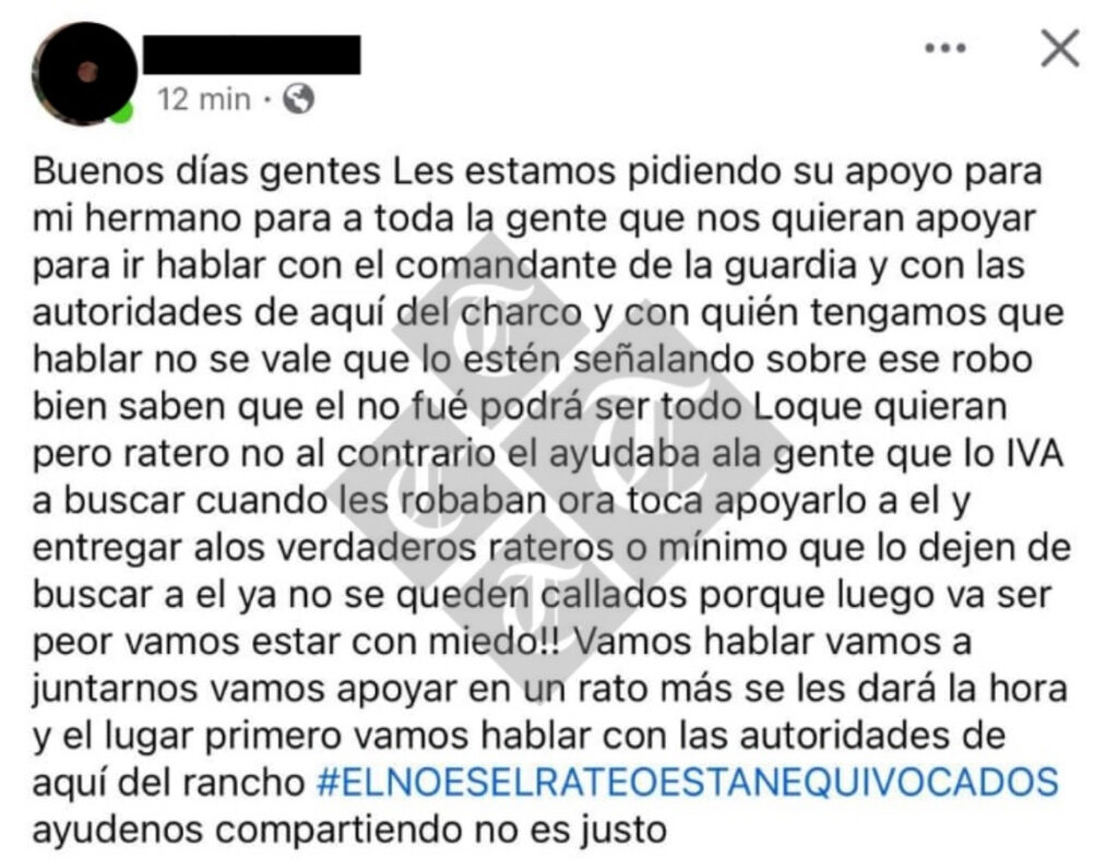 Familiares y personas cercanas a “El Xholo” y “El Viza” iniciaron una campaña de apoyo a través de redes sociales, en la que solicitan que no sean detenidos ni perseguidos por las autoridades. En las publicaciones, incluso se plantea la posibilidad de trasladarse a la Ciudad de México para buscar respaldo y exponer su postura ante instancias federales, argumentando que ambos han sido señalados de manera injusta por habitantes de la región.