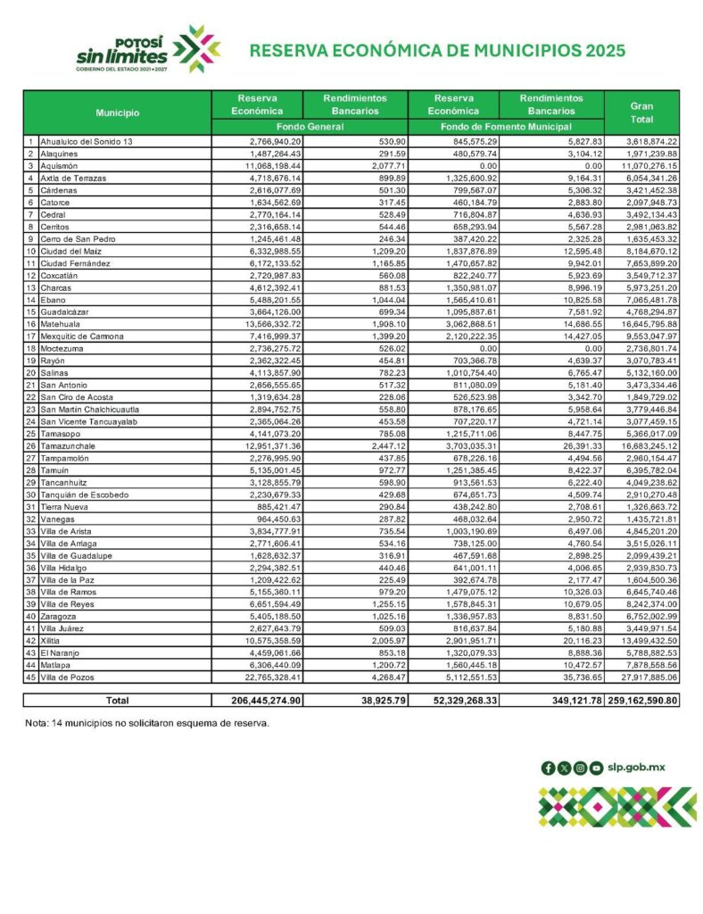 Matehuala destaca como uno de los municipios con mayor monto asignado en todo el estado, al recibir 16 millones 645 mil 795.88 pesos provenientes de este esquema. En contraste, 14 municipios no participaron en este mecanismo de ahorro y por lo tanto no recibirán recursos de la Reserva Económica en el cierre del ejercicio fiscal.