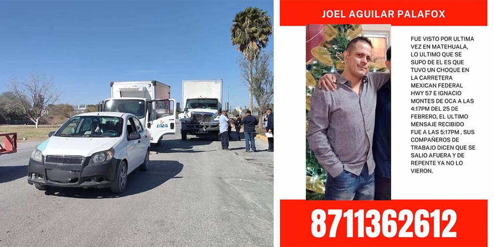 Joel Aguilar Palafox fue reportado como desaparecido luego de haber sido visto por última vez la tarde del miércoles 25 de febrero en el municipio de Matehuala. De acuerdo con la información proporcionada por familiares y compañeros de trabajo, lo último que se supo de él es que estuvo involucrado en un choque sobre la carretera federal 57, a la altura de Ignacio Montes de Oca, alrededor de las 4:17 de la tarde. El último mensaje que se recibió de su parte fue a las 5:17 p.m.