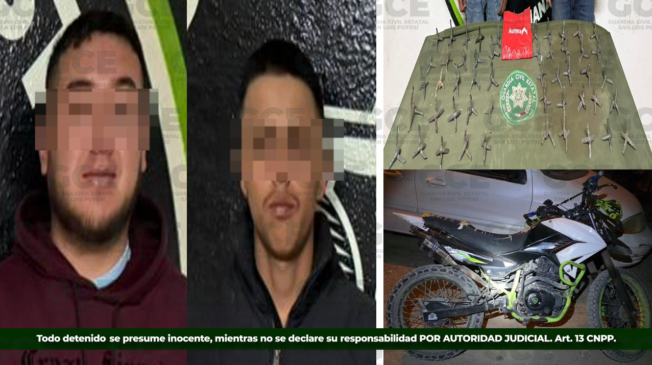 En el municipio de Matehuala, los agentes estatales aseguraron a Cristian “N”, de 19 años, y Eduardo “N”, de 24 años, por el presunto delito de posesión de arma prohibida. Durante la intervención, se les aseguraron 45 artefactos conocidos como “ponchallantas”, así como una motocicleta en la que presuntamente se desplazaban.