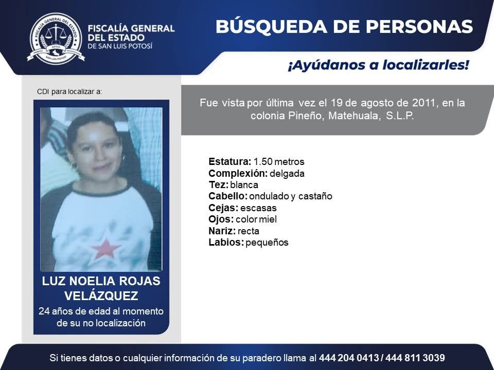 La Fiscalía Especializada en Derechos Humanos ha reactivado la búsqueda de Luz Noelia Rojas Velásquez, quien fue vista por última vez hace 14 años en la colonia El Pineño, en Matehuala. La dependencia hace un llamado a la ciudadanía para proporcionar cualquier información que pueda ayudar a dar con su paradero, mientras sus familiares mantienen la esperanza de encontrarla con vida y conocer la verdad sobre su desaparición.
