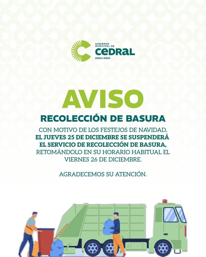 Las autoridades municipales señalaron que el servicio de recolección se reanudará con normalidad el viernes 26 de diciembre, en los horarios y rutas habituales, por lo que pidieron a la población organizarse con anticipación. De igual forma, en el municipio de Cedral también se suspendió la recolección, agradeciendo a la ciudadanía su comprensión y colaboración para mantener un municipio limpio y ordenado.