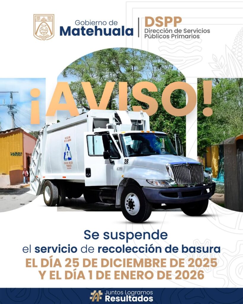 El Ayuntamiento de Matehuala informó que el servicio de recolección de basura fue suspendido este jueves 25 de diciembre de 2025, con motivo de la celebración de la Navidad. La autoridad municipal solicitó la comprensión de la ciudadanía ante esta pausa temporal en la operación del servicio en toda la ciudad.