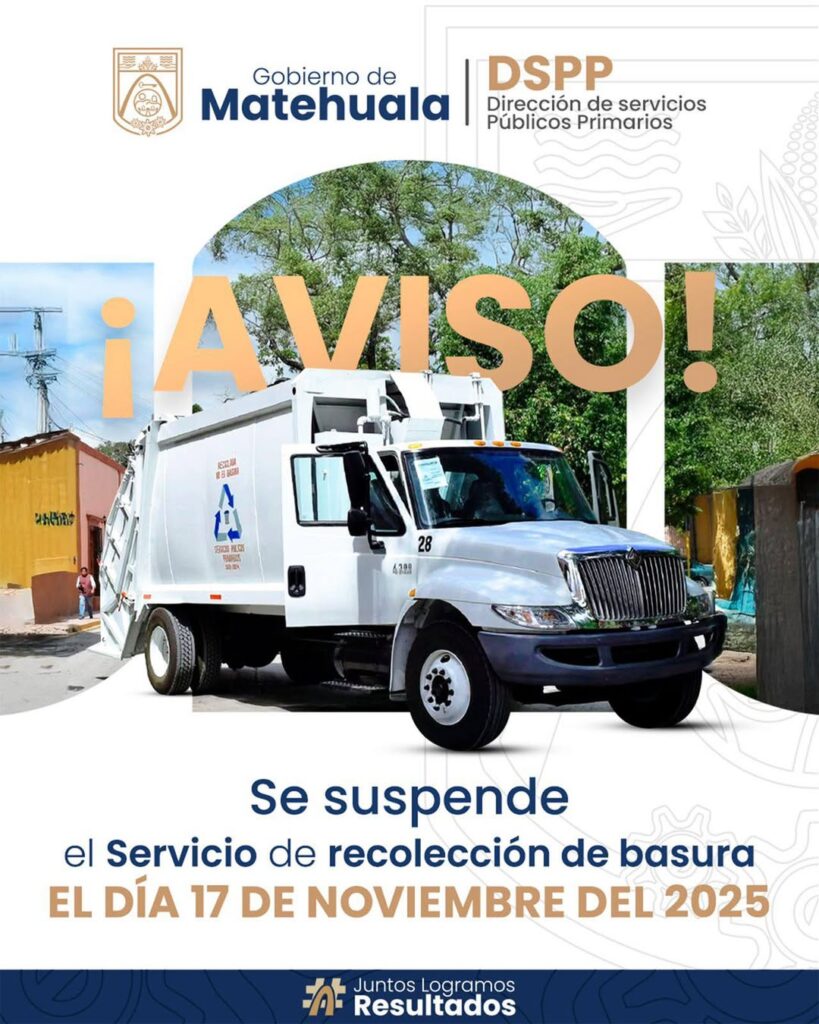 Las autoridades municipales señalaron que el servicio de recolección se reanudará con normalidad el martes 18 de noviembre en sus horarios y rutas habituales, por lo que se pide a la población organizarse con anticipación y evitar generar puntos de acumulación.