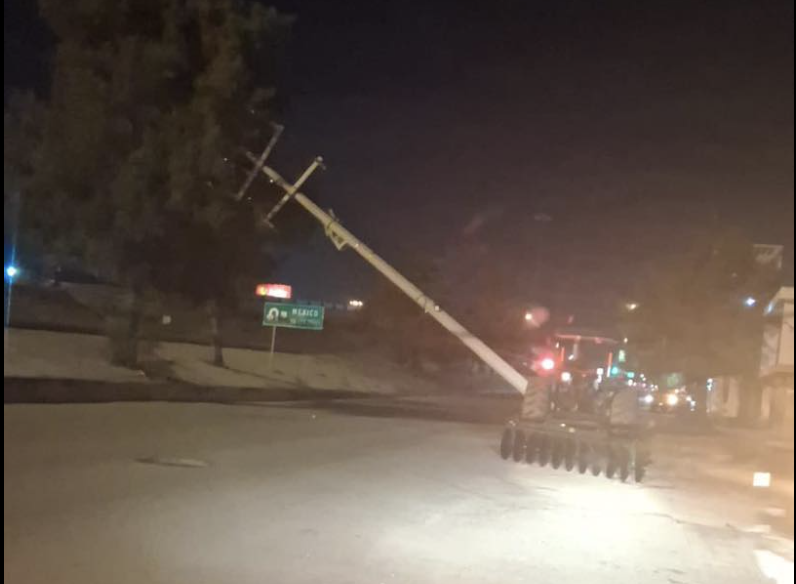 La noche del miércoles 22 de octubre se registró un aparatoso accidente en la colonia República, luego de que un tractor derribara un poste de energía eléctrica a la altura del Club de Leones, lo que provocó una amplia afectación en el suministro de luz en distintos sectores de la ciudad.