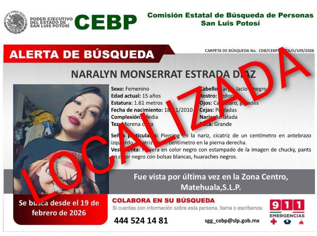 La Comisión Estatal de Búsqueda de Personas compartió este sábado la ficha de búsqueda con la leyenda de localización de Naralyn Monserrat Estrada Díaz, desaparecida desde el pasado 19 de febrero de 2026 en la colonia Centro de Matehuala.