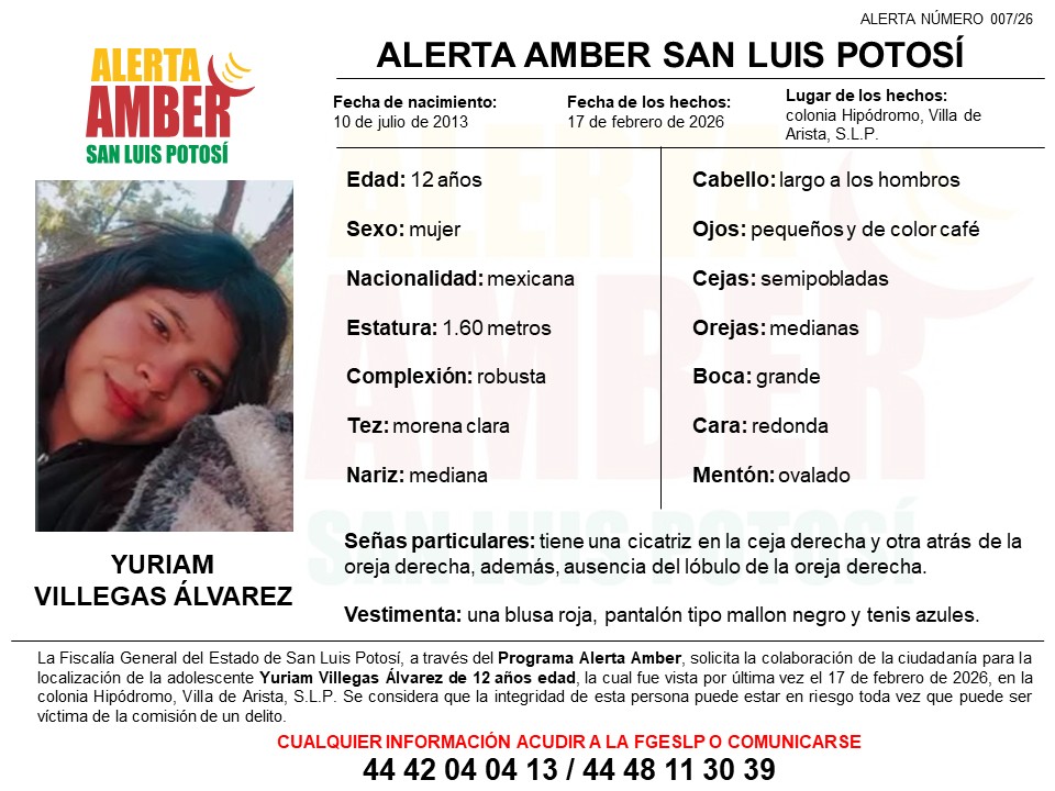 La Fiscalía General del Estado de San Luis Potosí (FGESLP) activó una ficha de Alerta Amber para la localización de Yuriam Villegas Álvarez, quien tuvo contacto por última vez con sus familiares el 17 de febrero de 2026, en la colonia Hipódromo, de Villa de Arista.