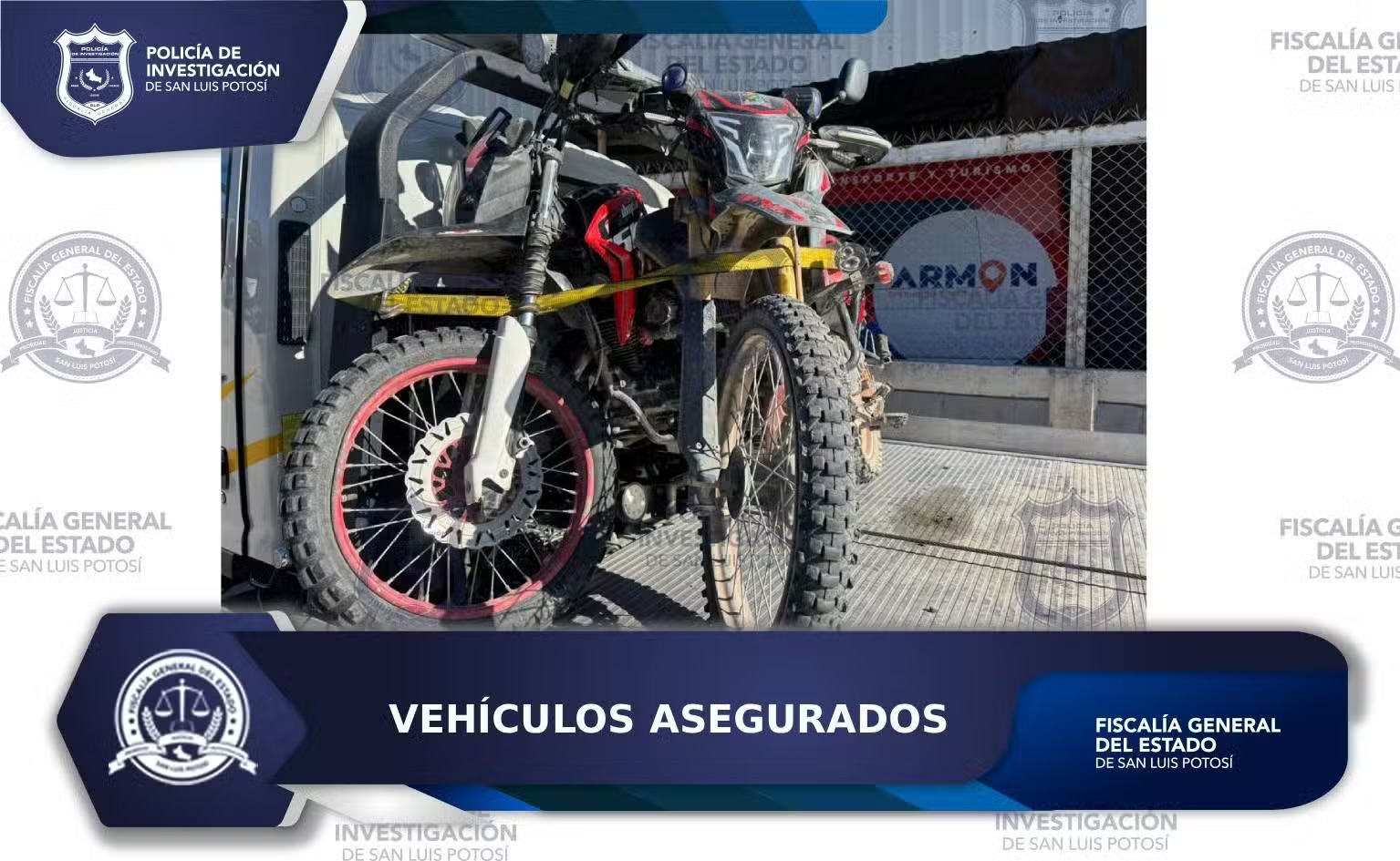 Los vehículos asegurados corresponden a una motocicleta marca Italika, tipo DM150, color rojo combinado con negro, modelo 2019, sin placas de circulación, así como una motocicleta marca Vento, submarca Pro Slider, color rojo combinado con negro, modelo 2024.