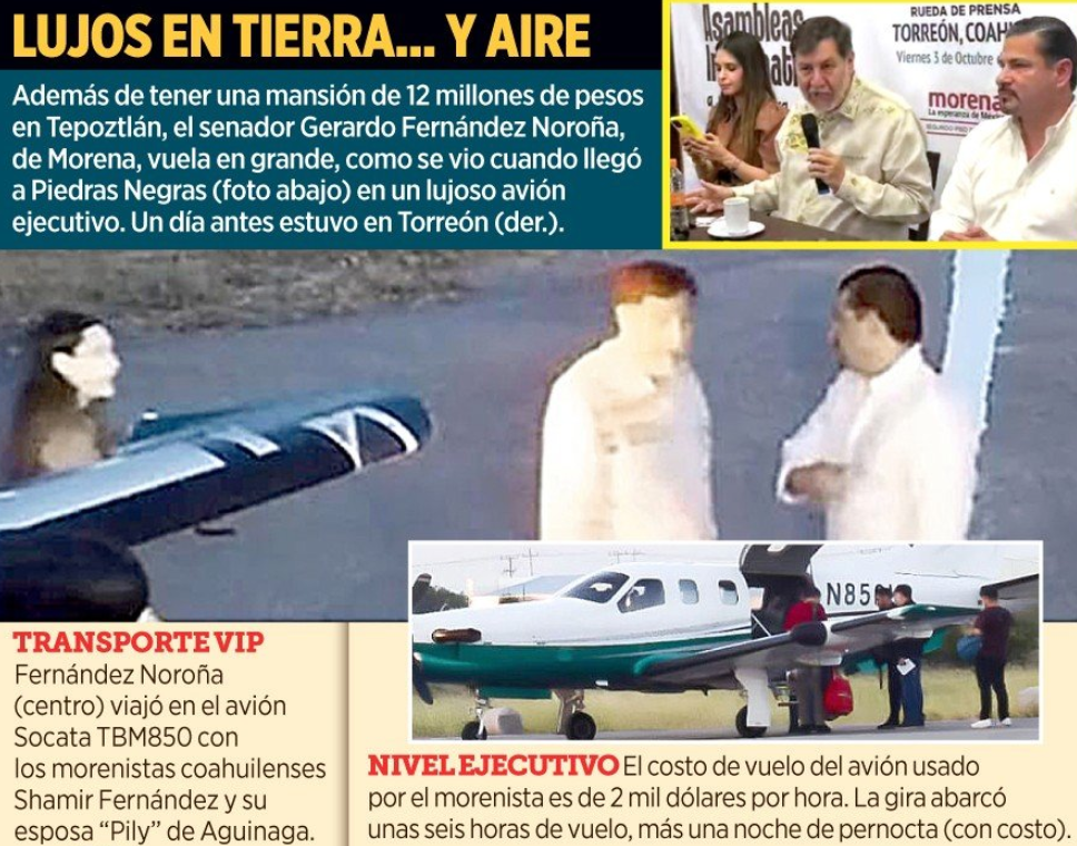 Una investigación publicada por el periódico Reforma, asegura que el expresidente del Senado de la República se trasladó, el pasado fin de semana, en un avión privado de lujo, cuyo costo ronda los 2 mil dólares por hora, es decir, alrededor de 36 mil 700 pesos por hora.