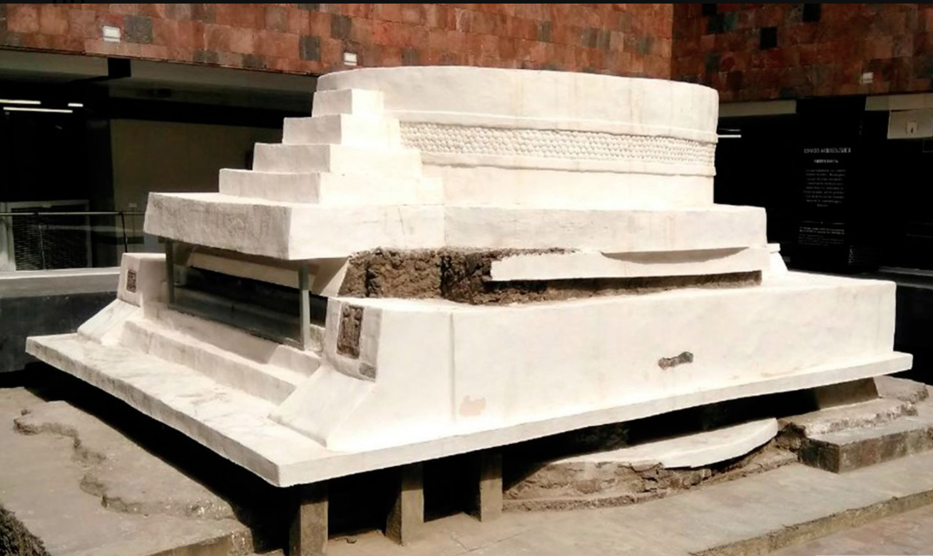 El monumento presenta cuatro etapas constructivas y una base circular donde originalmente se colocaba la imagen del dios. Entre sus ofrendas destaca la escultura conocida como “La monita”, un mono policromado que porta la máscara bucal de Ehécatl y está acompañado por dos serpientes, símbolos del dios del viento.